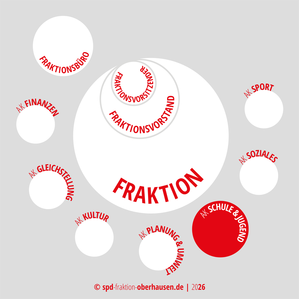 Der Arbeitskreis Schule und Jugend besteht aus den Rats- und Bürgermitgliedern des Schulausschusses der Stadt Oberhausen sowie des Jugendhilfeausschusses. Hinzu kommen Mitglieder aus den drei Bezirksvertretungen und aus der Partei, soweit benannt. Leiterin des AK Schule und Jugend ist die stellvertretende Fraktionsvorsitzende Denise Horn.