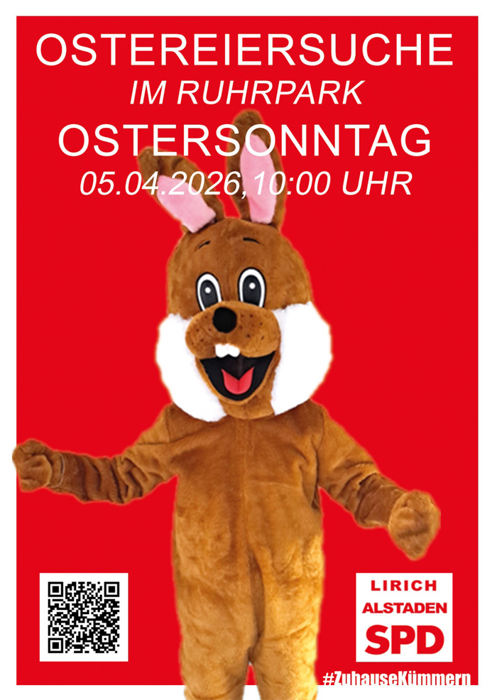 Am Ostersonntag sind rund 200 Bürgerinnen und Bürger aus Alstaden und den benachbarten Stadtteilen zur 56. Auflage der traditionellen Ostereiersuche des SPD-Ortsvereins Oberhausen-West in den Ruhrpark gekommen. "Die Veranstaltung im Ruhrpark gehört in Alstaden seit Jahrzehnten zum Osterfest – so wie Ostereier und Schokohasen", freute sich der Ortsvereinsvorsitzende Alexis Heitmann über den großen Zulauf.