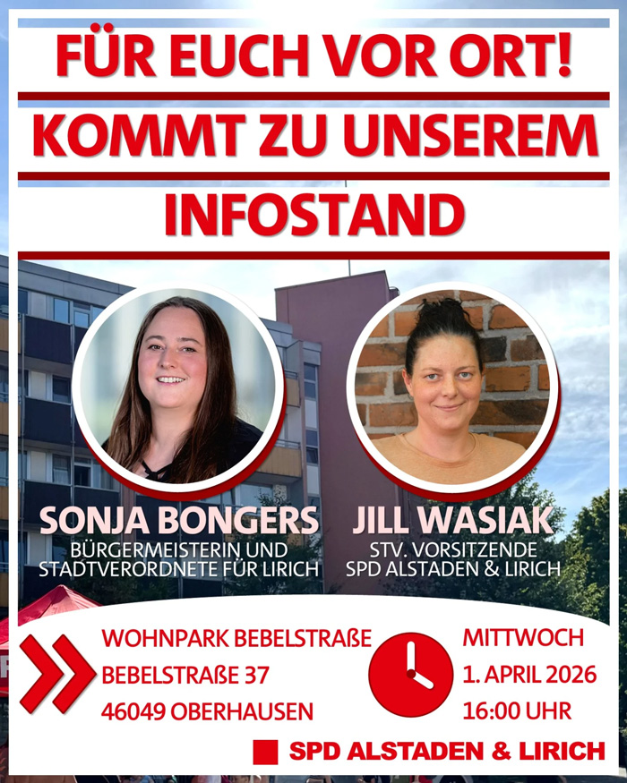 Im Rahmen seiner diesjährigen Jahreshauptversammlung hat der SPD-Ortsverein Oberhausen-West, zuständig für die Stadtteile Alstaden und Lirich, am 03.03.2026 ein klares Votum für Sonja Bongers abgegeben. Mit 100 Prozent unterstützten die rund 30 anwesenden Sozialdemokratinnen und Sozialdemokraten die Bewerbung ihrer stellvertretenden Ortsvereinsvorsitzenden um eine erneute Kandidatur für den nordrhein-westfälischen Landtag und setzten damit ein geschlossenes Signal mit Blick auf die im Frühjahr 2027 anstehende Wahl.