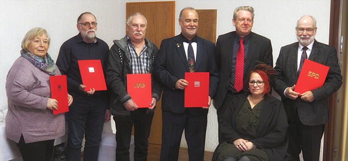 Gruppenfoto der Jubilahre mit dem Bundestagsabgeordneten Dirk Vöpel und der stellvertretenden Vorsitzenden Nicole Kopp-Czech.
