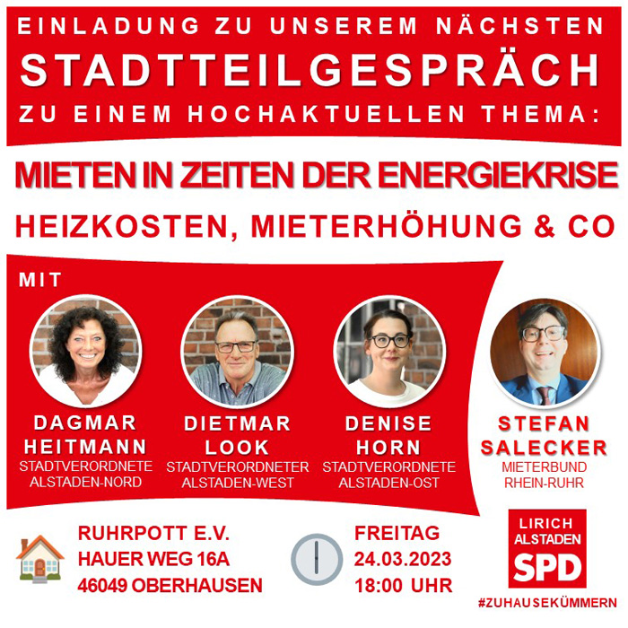 Eine Woche später, am Freitag, 24.03.2023, findet das nächste Alstadener Stadtteilgespräch statt. Hierfür konnte die SPD einen spannenden Referenten gewinnen. Ab 18.00 Uhr trägt Rechtsanwalt Stefan Salecker vom Mieterbund Rhein-Ruhr zu Fragen rund um Energiekosten, Mieterschutz und die Betriebskostenabrechnung vor. Im Anschluss stehen die Alstadener SPD-Stadtverordneten Denise Horn, Dietmar Look, Dagmar Heitmann und die Landtagsabgeordnete Sonja Bongers für Gespräche und Anliegen zur Verfügung.