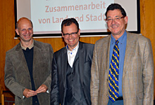Der Landtagsabgeordnete für Oberhausen-Sterkrade und Dinslaken Stefan Zimkeit mit Dinslakens Bürgermeister Dr. Michael Heidinger und Uli Real, Bezirksbürgermeister von Sterkrade